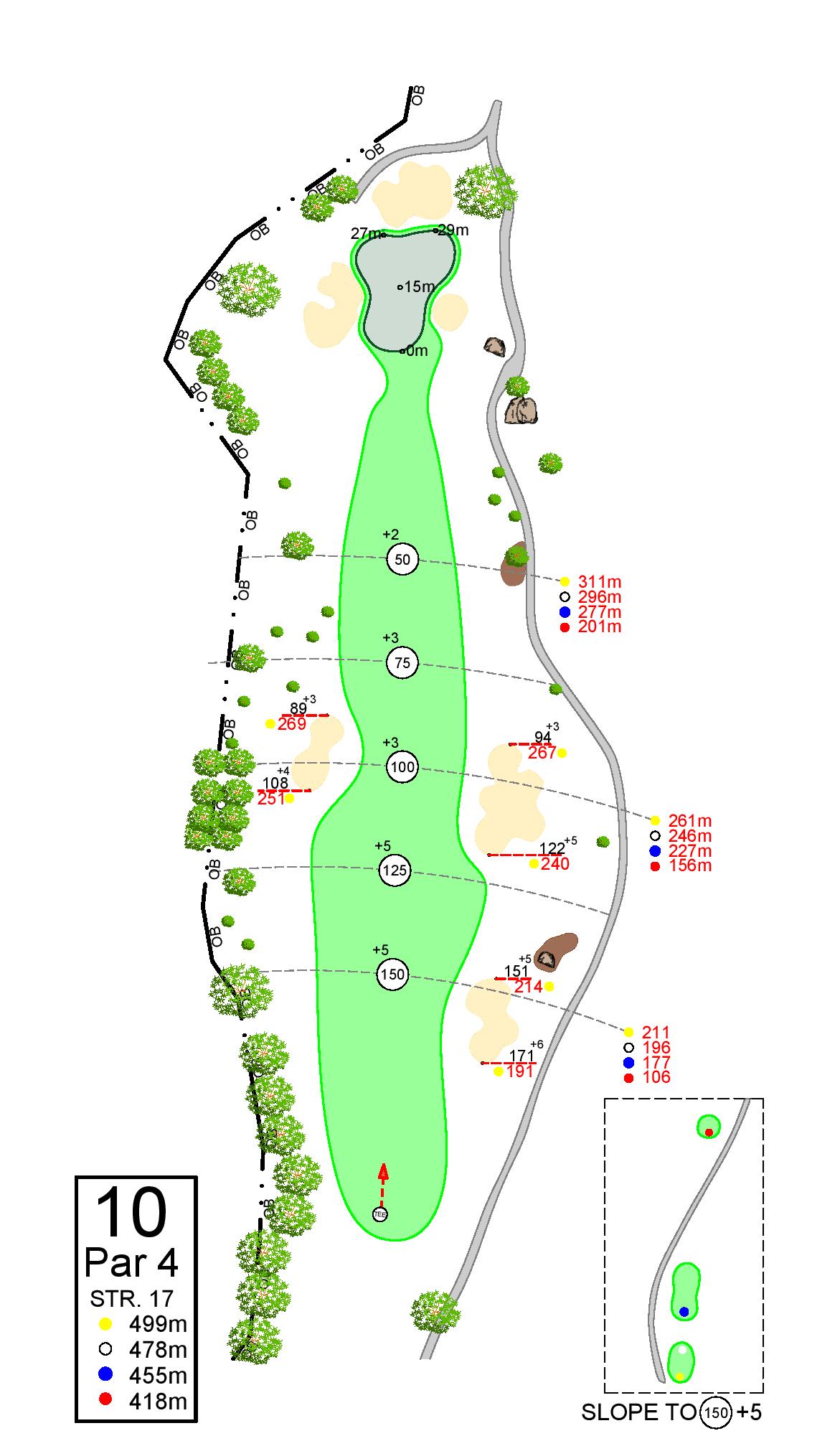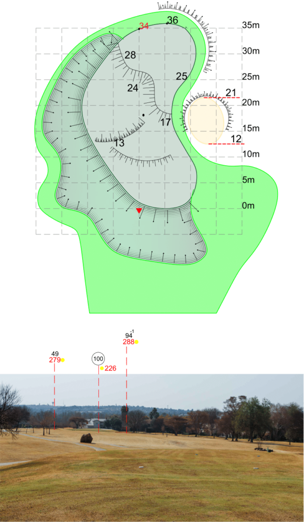 Relevant distance (in meters) to include: Carries + runout ,penalty areas, tee to fairway and fairway to green elevation change, to green ,compass off tee shot and into greens